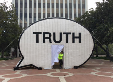 On April 17, 2017 Palo Altans spent the day trying to answer the question, 'What is Your Truth?' when the acclaimed In Search of the Truth (The Truth Booth) project made an appearance on King Plaza in front of City Hall. The giant inflatable speech bubble and video recording booth popped up in front of the City of Palo Alto City Hall. The public was invited to enter and record two-minute videos beginning with the statement, 'The truth is..' The Truth Booth's creators have already captured thousands of definitions, representations, confessions, and thoughts on 'the truth' worldwide, and continue to engage the public in an interactive experience with art, media, and free speech. Participation was free and open to all.This public art intervention took place on April 19, 2017.